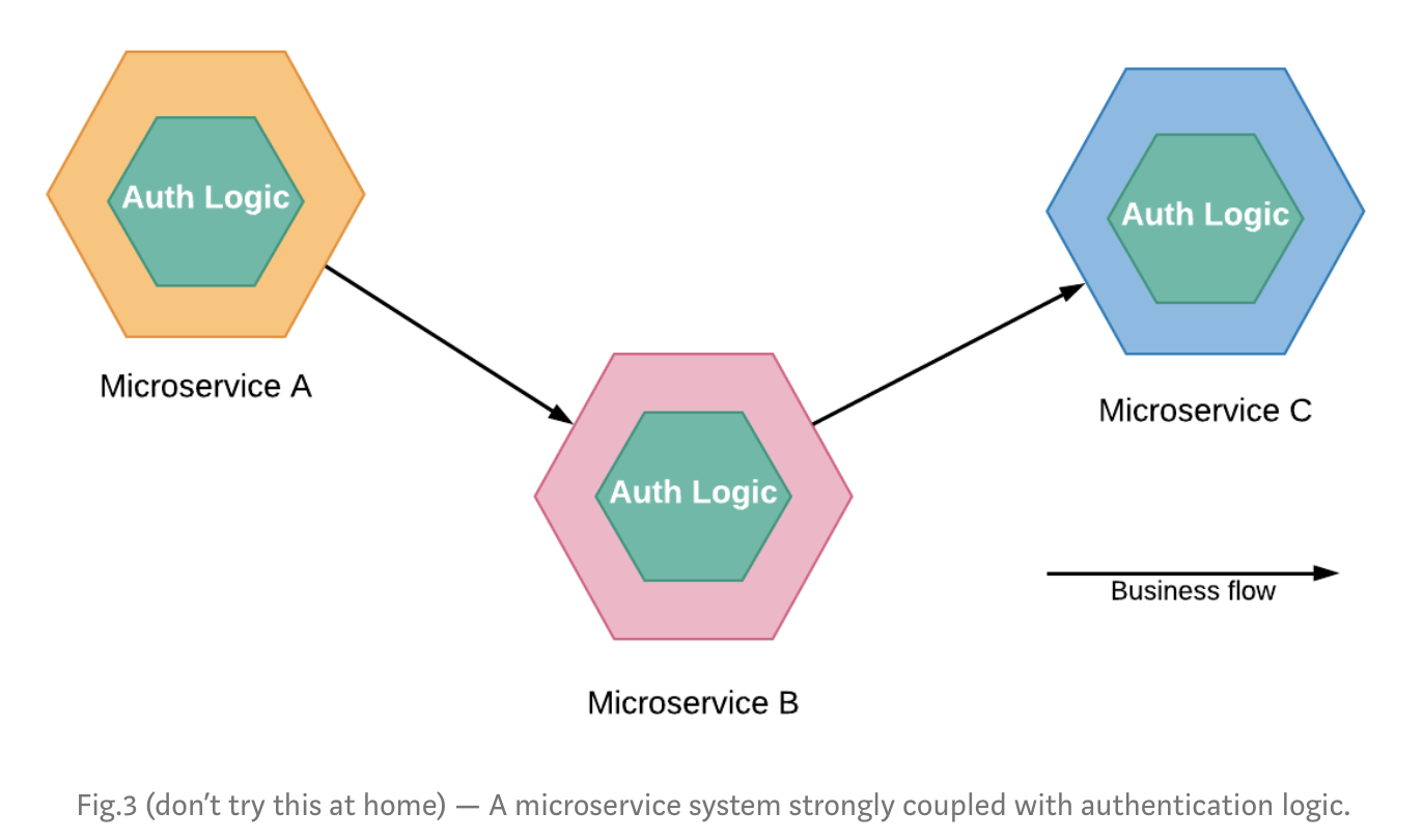 하지만 요즘은 microservices 시대. 아래와같이 Auth Logic이 Business Logic과 같이 있다면 비효율적이다. (Auth Logic 버그 하나 생기면 모두 배포해야..)