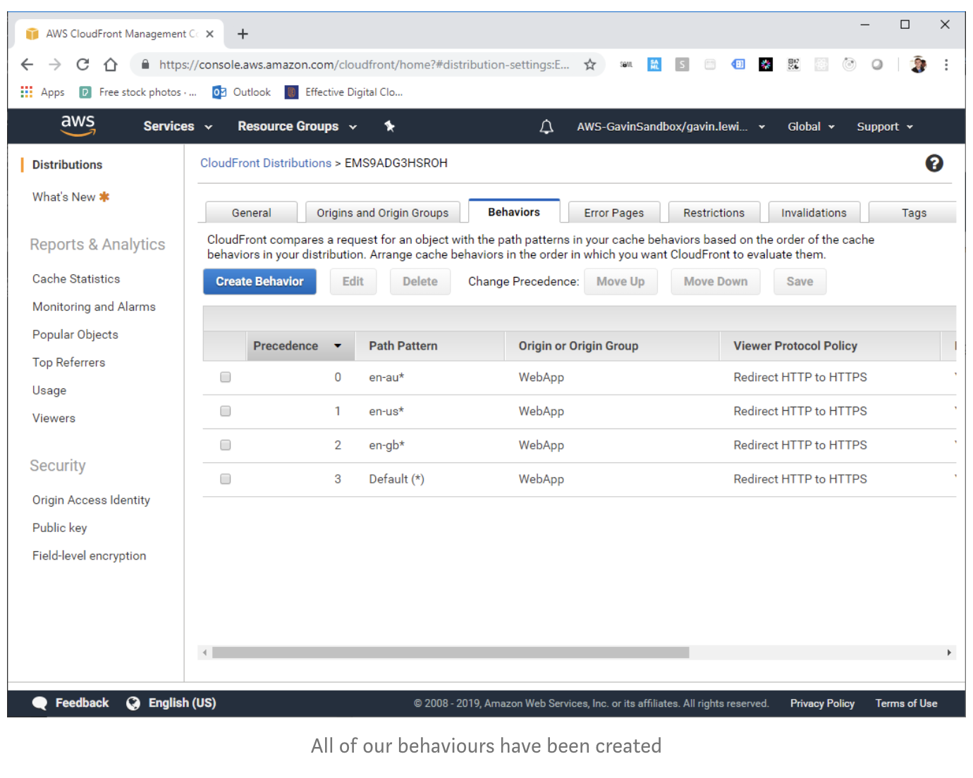 언어별로 다른 S3 복사본 경로로 가도록 추가적인 behaviors 를 설정 : 예) en-au의 경우는 s3://bucketname/en-au*로 요청