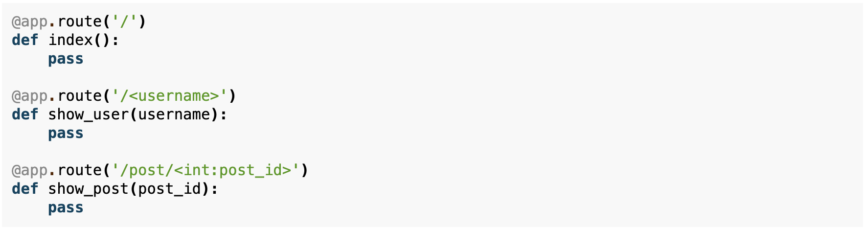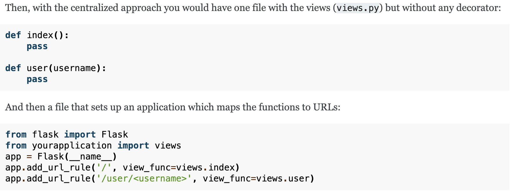 URLs은 기본적으로 decorator 를 통해 설정한다. Django 처럼 separated out한곳에 설정하는것도 가능하다.