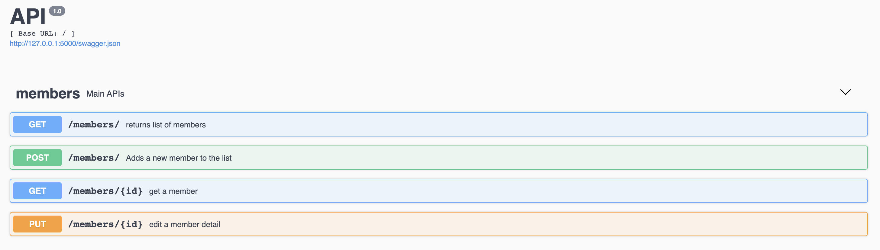 Swagger UI가 어떻게 보이는지 보기위해 주석으로 표시하면 아래와 같이 namespace가 나오고 각 API (POST, GET, PUT)이 자동으로 UI에 보여진다.