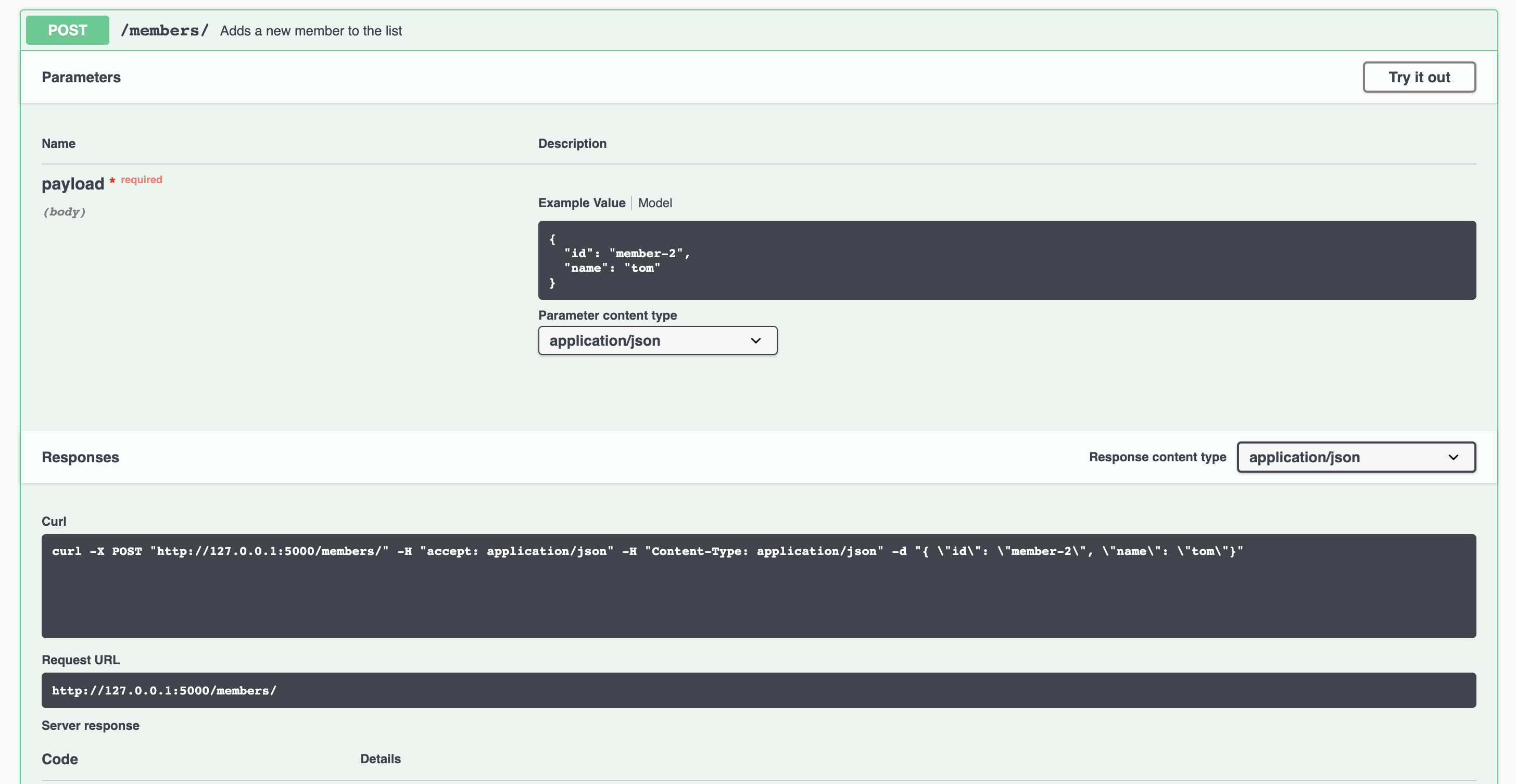 해당 함수 (POST)에 실제 model 을 연결 @app.expect(model) 시키면 Swagger UI에서 테스트도 가능하다!