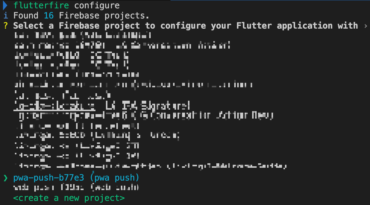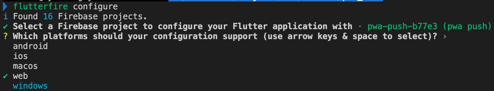 ✔ Select a Firebase project to configure your Flutter application with · pwa-push-b77e3 (pwa push)