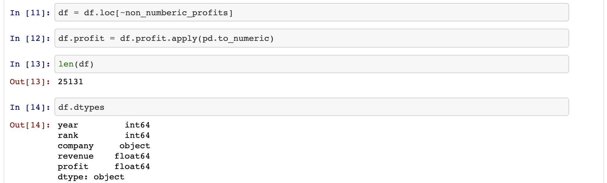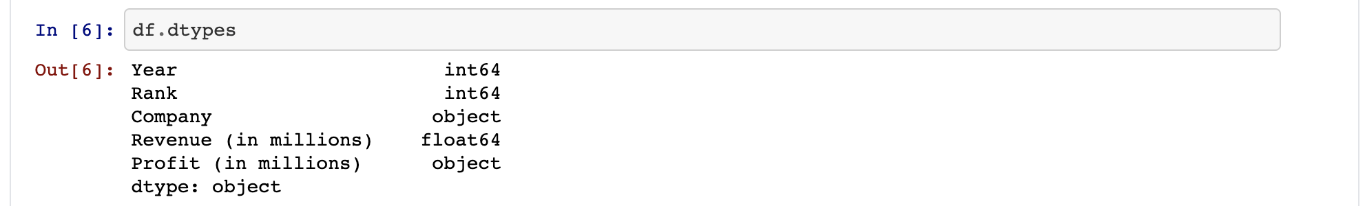 fortune500 data를 가져와서 값의 손실이 있는지를 확인하기 위해 dtypes를 체크하는데, profit 이 숫자가 아닌 object 인것을 보면 'NA'인 data가 있다는 것을 알수 있다.
