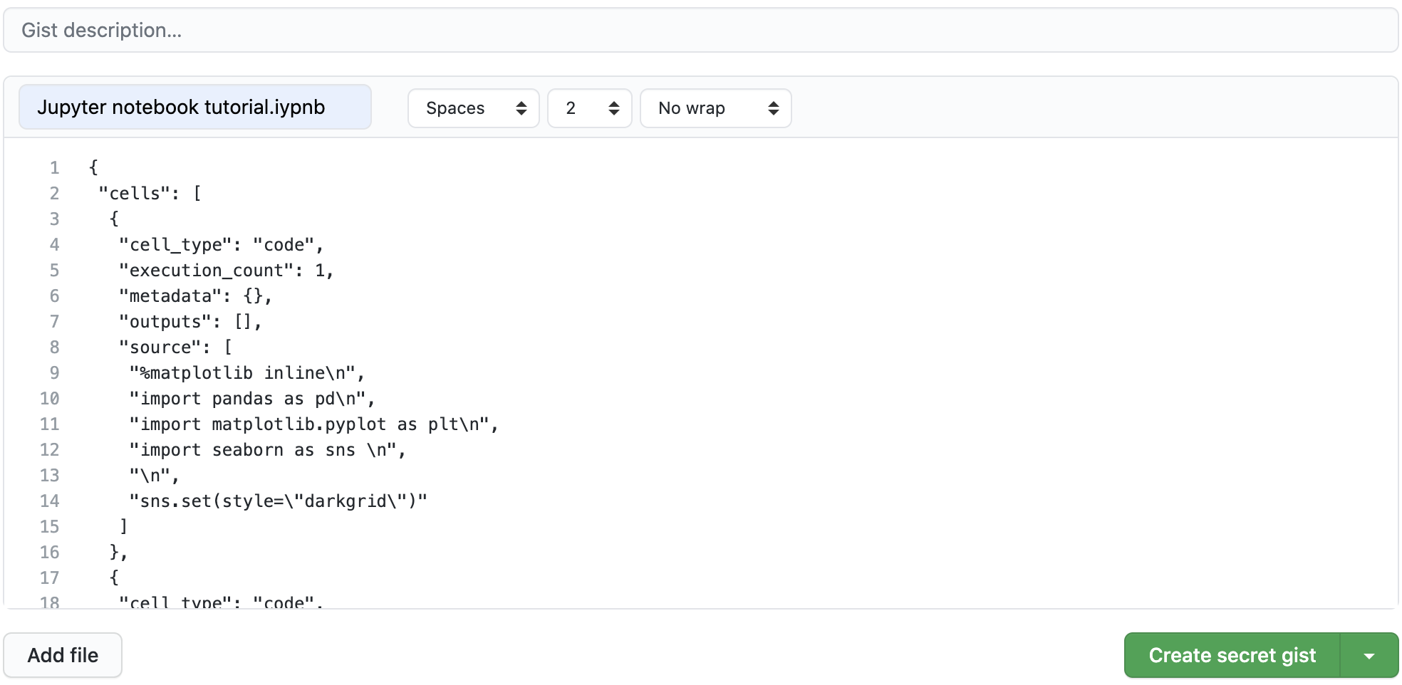 먼저 아래 처럼 notebook의 .ipynb 파일을 text editor에서 열어서 json 현태의 내용을 copy한다.