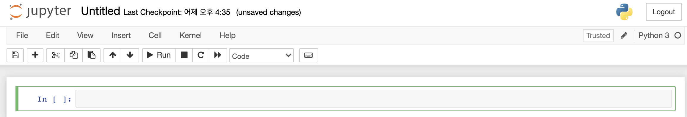 그러면 내 코드와 결과물을 작성할 수 있는 notebook 파일이 생성된다. Untitled 을 원하는 이름으로 변경.