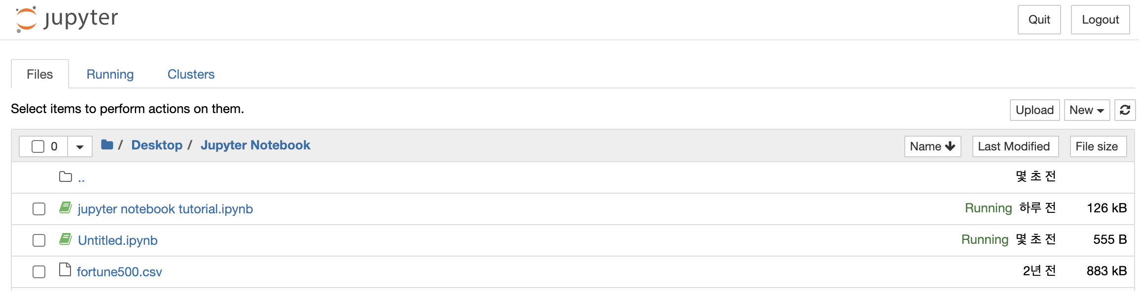 준비가 다 되었으면 Jupyter Notebook 실행. 내 컴퓨터에서 로컬 서버가 실행되면서 browser에 jupyter 화면이 뜬다.