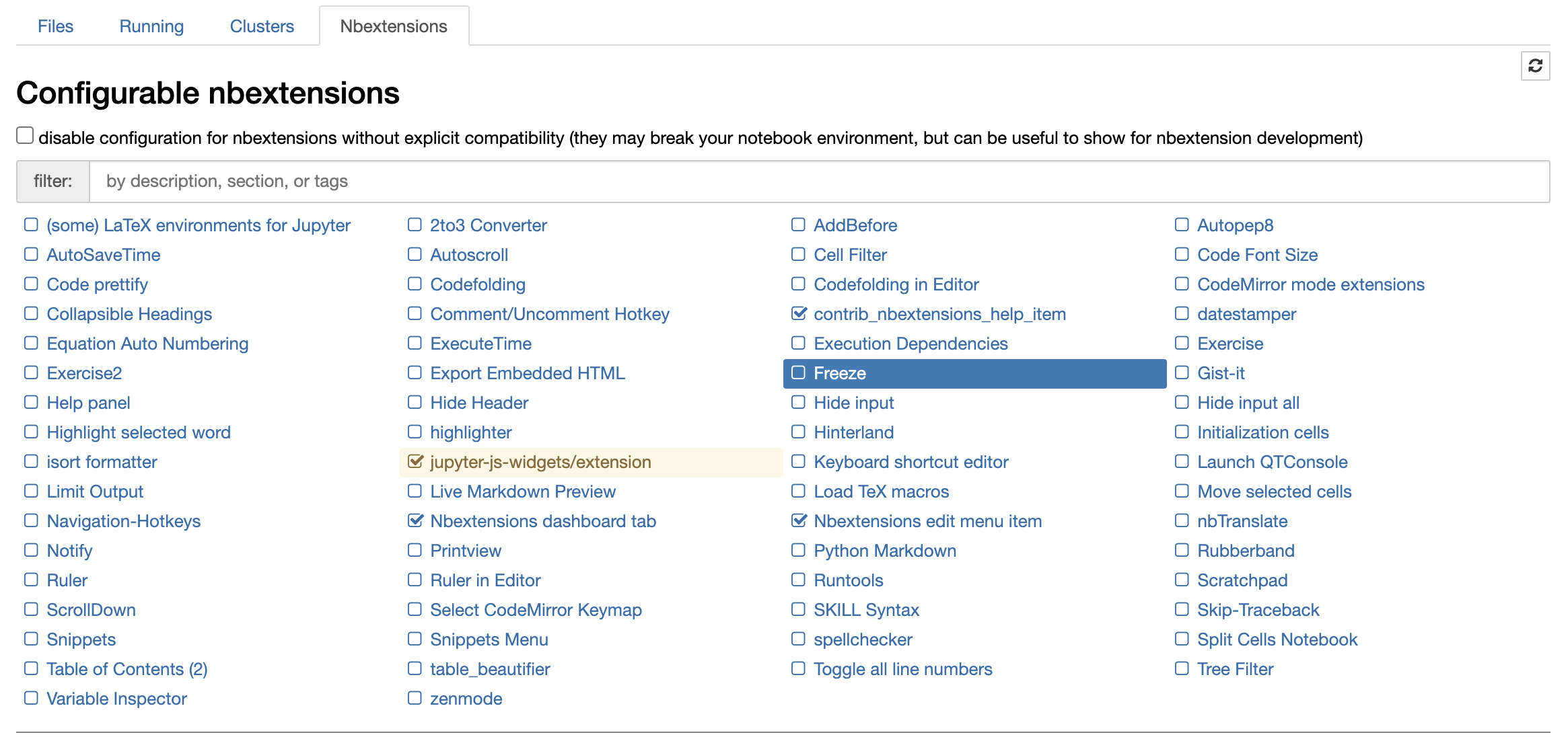 설치 여부는 notebook 종료 후 다시 켜면 아래와 같은 새로운 Nbextensions tab 이 나오면 되는데, 나 같은 경우도 처음엔 보이지 않아서 This thread on Github 도 참고하다가 안되어... jupyter-contrib-nbextensions.readthedocs.io/en/latest/install.html 참고하여 삭제후 다시 설치했다. ^^;;