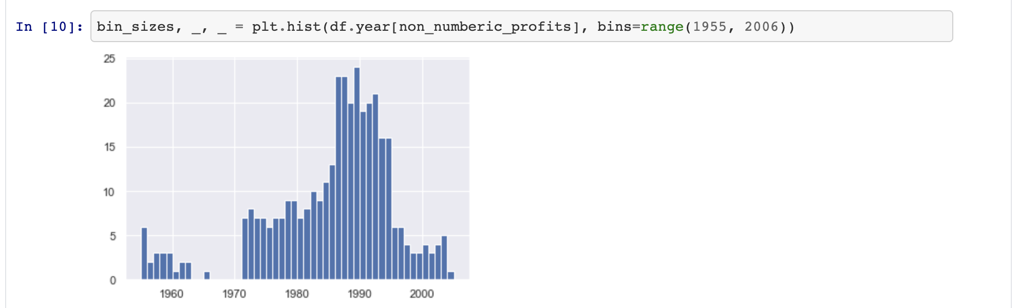이 'NA'가 어느정도 되는지 보고, 무시할 정도인지를 확인하는 작업이 필요하다. 이때 각각의 숫자로 보는것 보다 한눈에 볼수 있도록 histogram을 그려 보면 도움이 된다. 500기업중 가장 많은 손실이 23개가 안된다면 최대 4%대의 손실이라 무시할만하니 제거하면 된다.