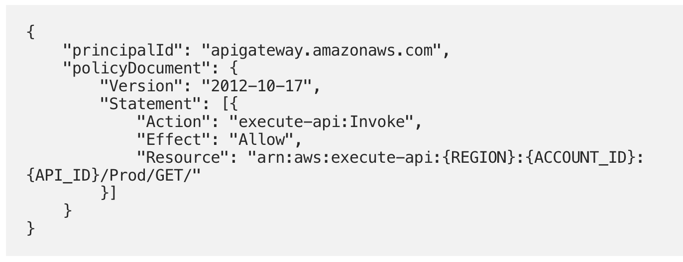 ARN이 "arn:aws:execute-api:{REGION}:{ACCOUNT_ID}:{API_ID}/Prod/GET/" 인 API Resource를 실행하는 것을 Allow 한다는것이다.