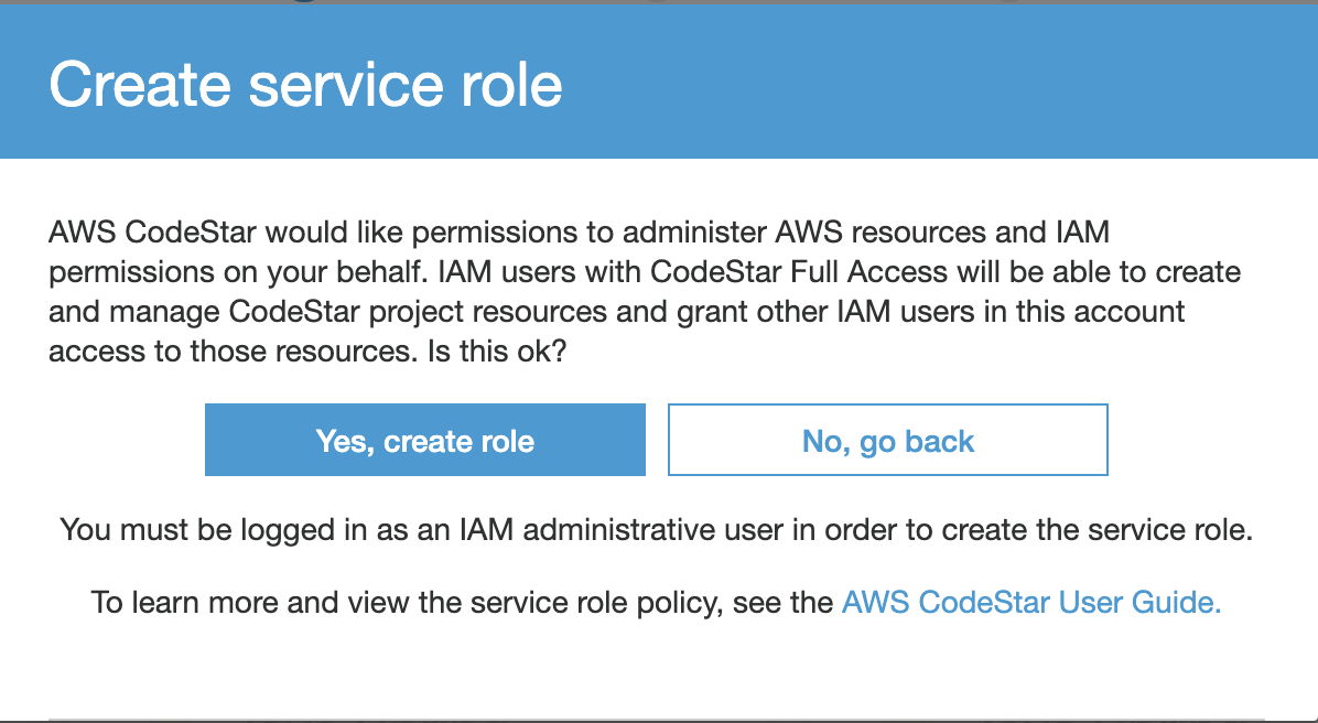 여기 블로그에서는 AWS CodeStar로 프로젝트를 만들었는데.. CodeStar 프로젝트를 만드려면 IAM administrative user 로 로그인해서 Service role을 만들어야 한다.