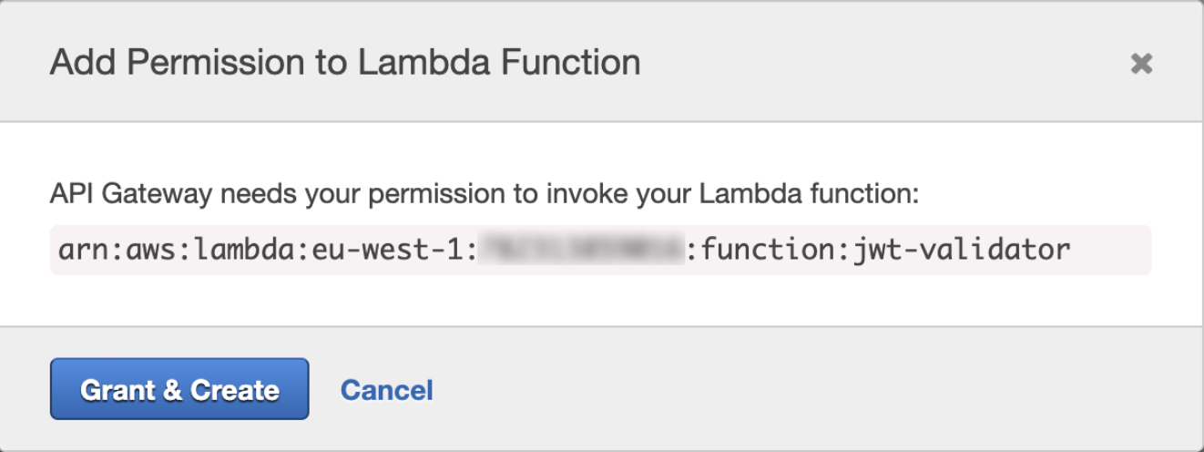그리고 "Create" 하면 아래와 같이 Lambda를 invoke하기 위한 permission을 grant 하는 pop up이 뜬다.
