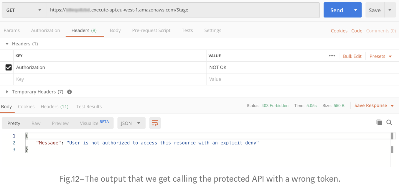 Test를 위해 "NOT OK"를 Authoization에 넣으면 예상대로 DenyPolicy가 Return된다.