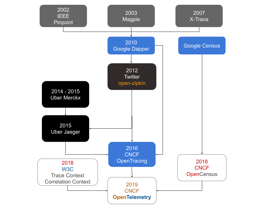 MSA (Microservice Archtecture)에 필요한 것이 바로 분산 추적 시스템이고, Zipkin 이 2012년에 나온뒤에 좀더 현대화된 구조로 만든 분산추적 시스템이 Jaeger (예거)다. 좀더 자세한 히스토리는 아래 그림이 한눈에 잘 보여준다.