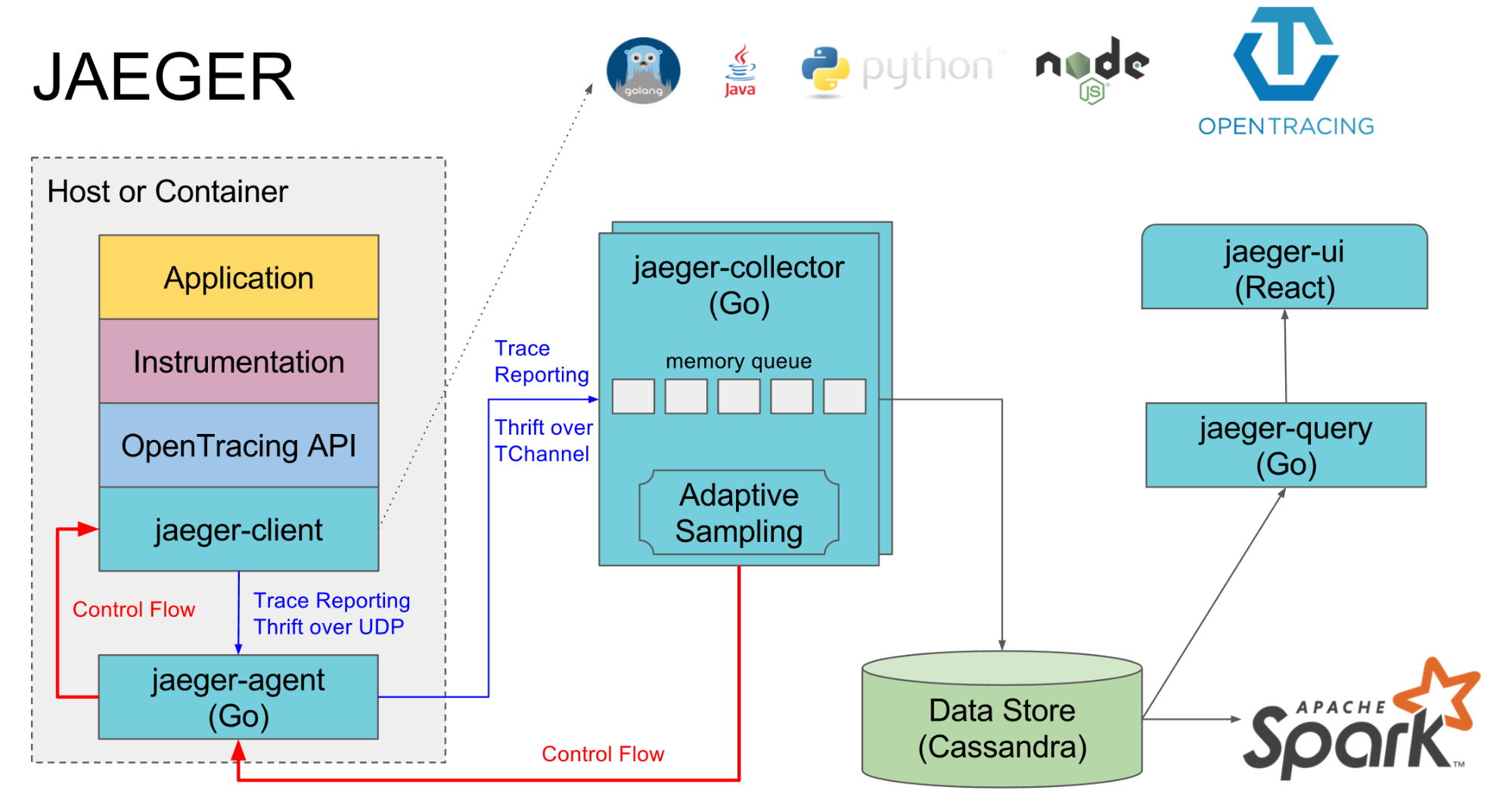 Jaeger는 그림에서처럼 CNCF OpenTracing API와 연동되고, 기본 구조는 아래와 같다.