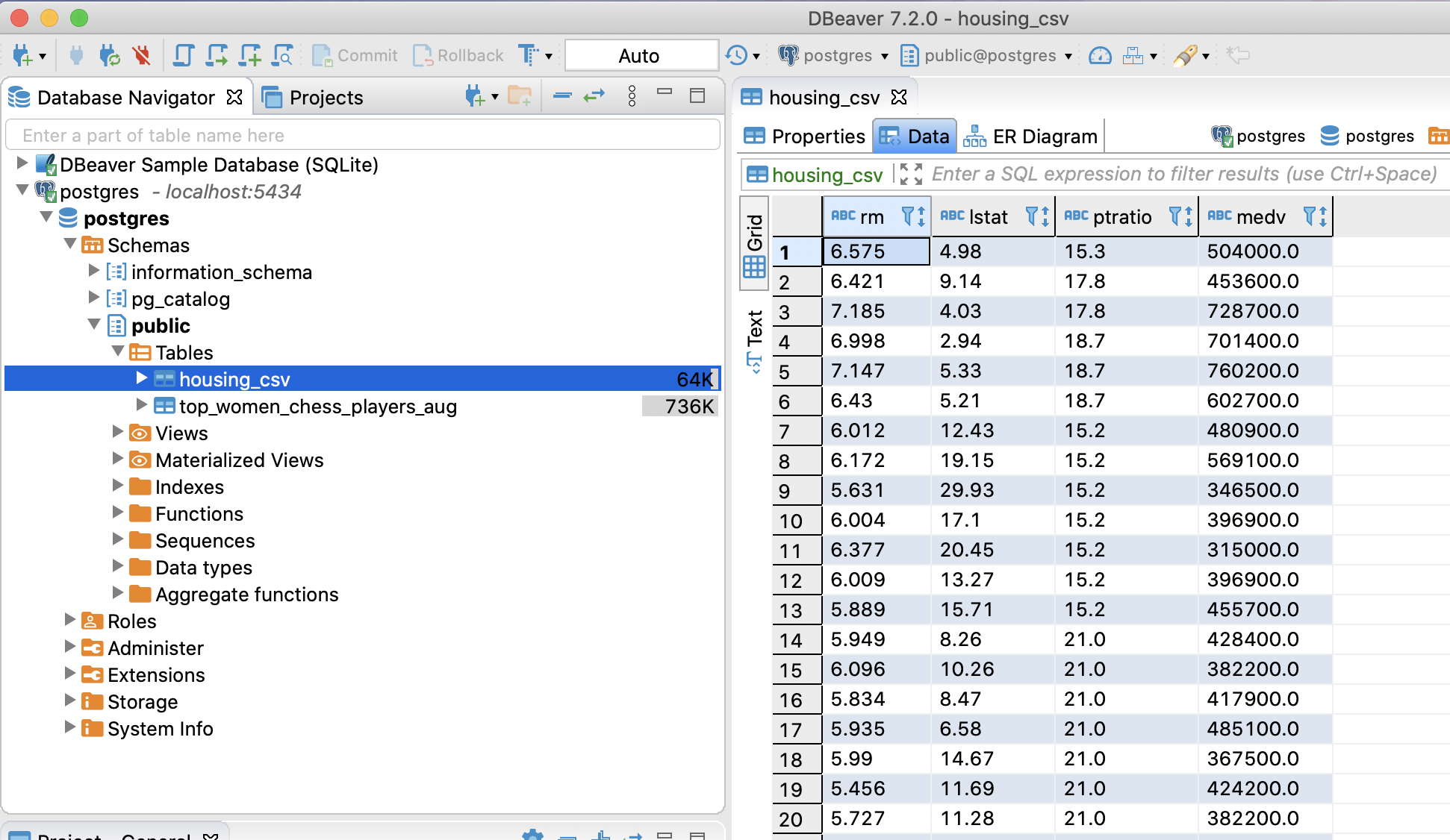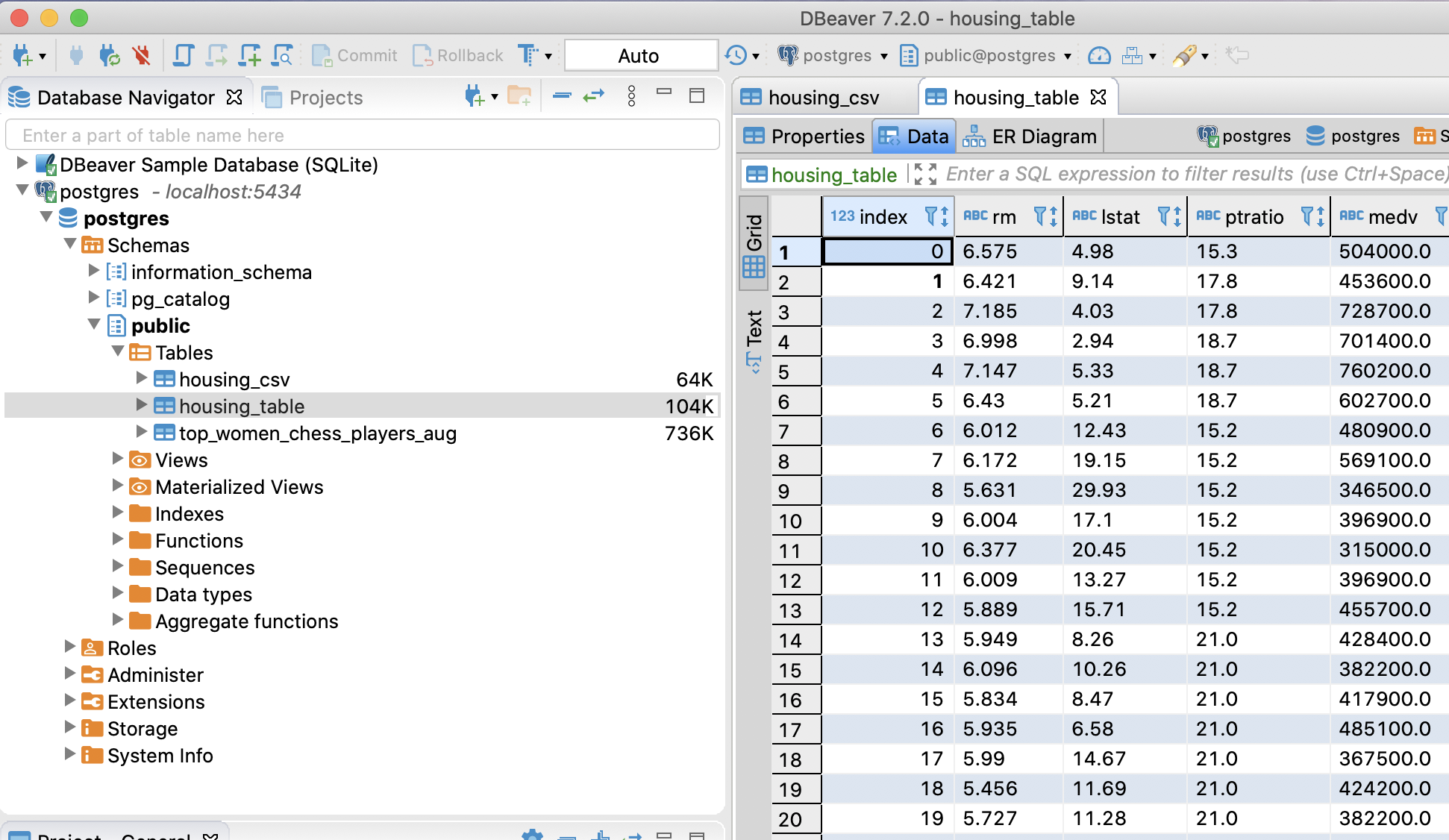 >>> data = pd.read_sql(''' SELECT * FROM public.housing_csv''', connection)
