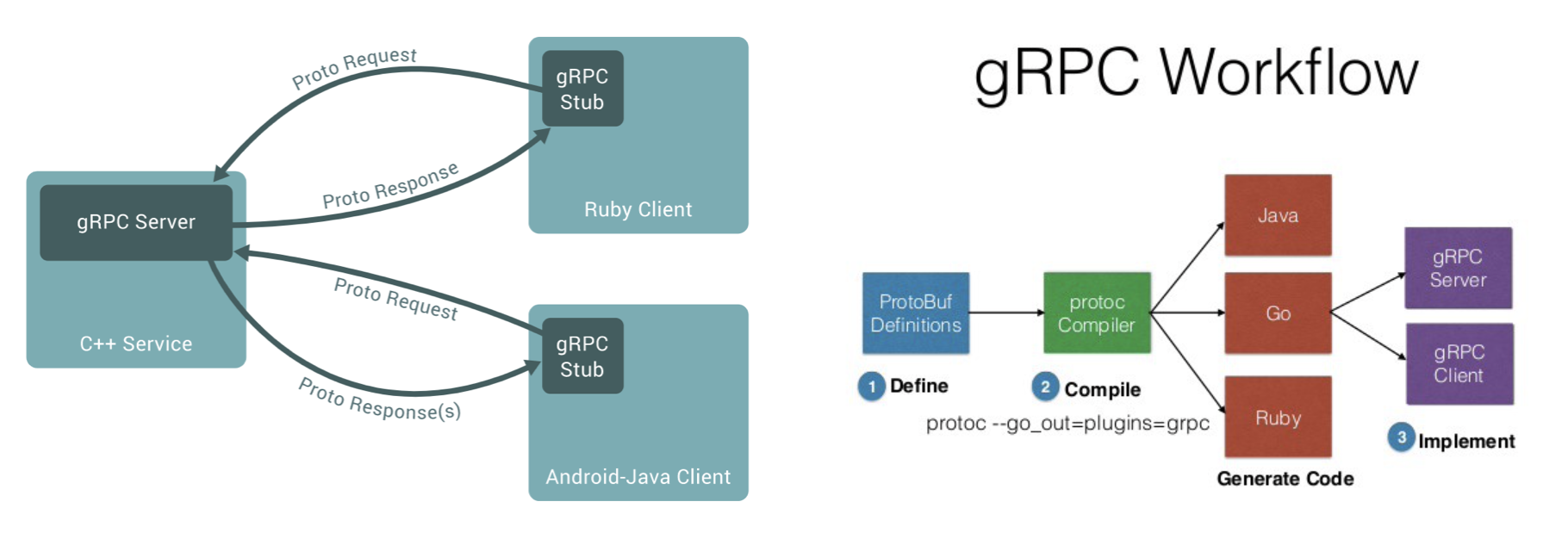 - gRPC 통신 방법은 1) .proto 정의 2) protoc 로 원하는 언어 (go) 로 compile 3) compile 한 .go 파일을 server와 client에 복사하여 server는 해당 .proto에 정의한 service interface를 구현하고, client는 이 method를 호출한다.